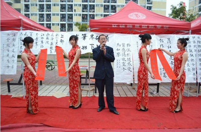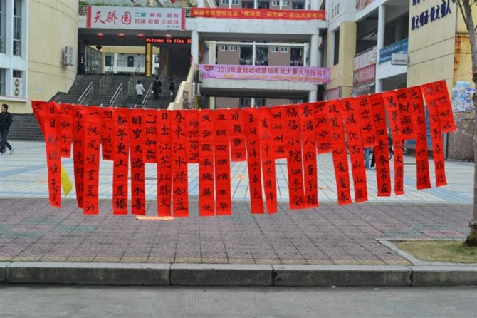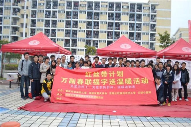 12月12日下午,重庆市驻福建省团工委、福建省重庆商会、涪陵区驻福州市团工委及天新公益园联合联合福州大学管理学院社团联合会和飘逸书法协会,在福州大学校内举办“红丝带计划”万副春联福字送温暖活动首场书写活动,本次书写春联福字的活动结合该校的书法比赛同时进行,众多大学生书法爱好者在比赛中奉献爱心,又得到了锻炼。据统计,当天共为“红丝带计划”书写了800多副春联和福字。
