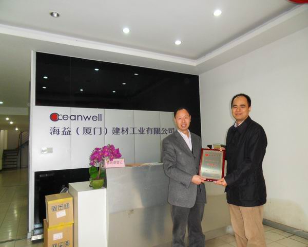 秘书长李吉华为“海益(厦门)建材工业有限公司” 董事长彭东授会员牌